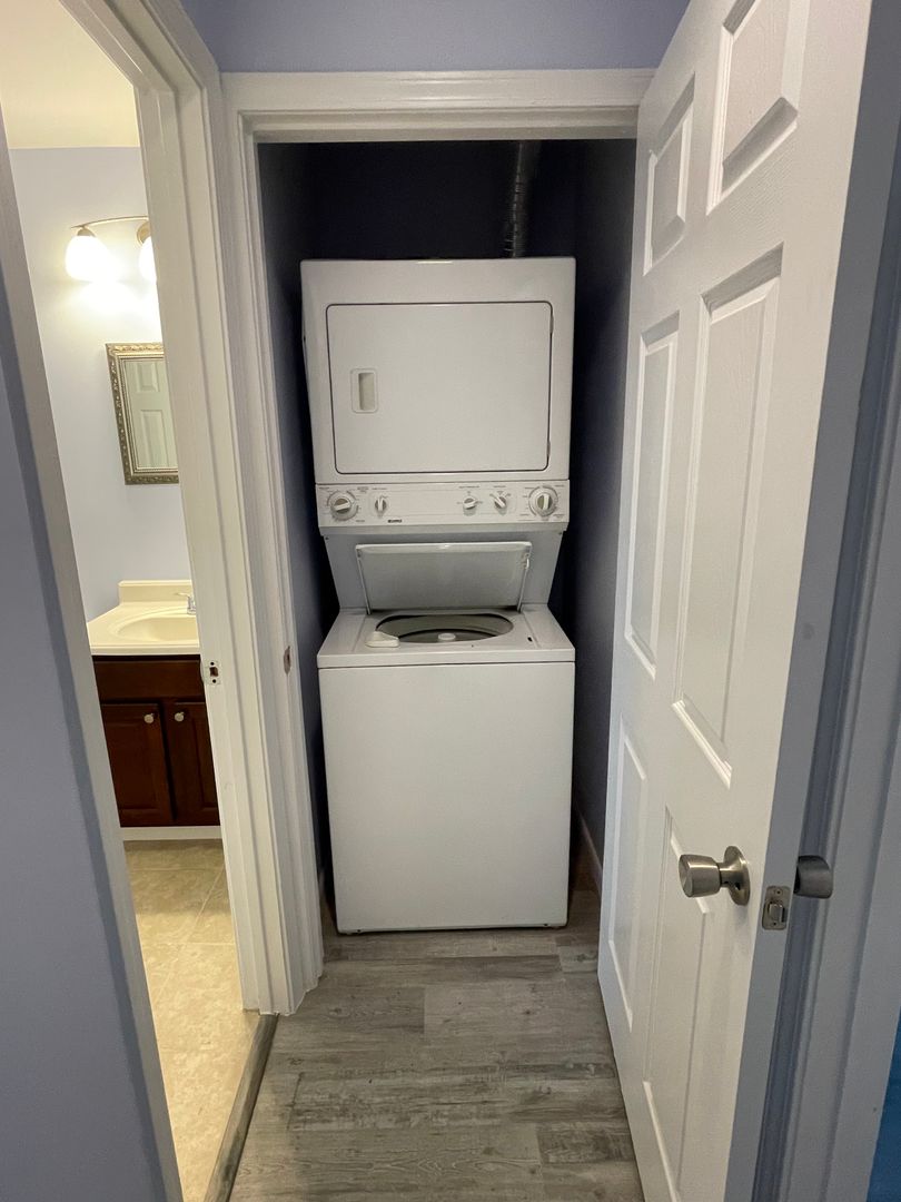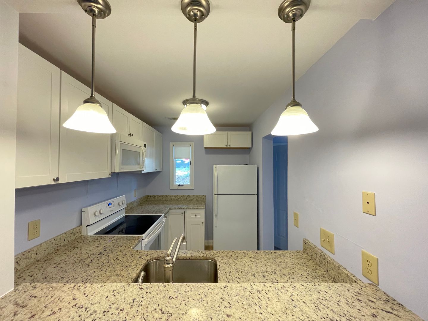 Featuring a garden-style floor-plan, unit E-4 has an updated interior with modern LVP flooring, a styish kitchen equipped with all appliances, a large living/dining area and two spacious bedrooms, each with its own bathroom. The living room and kitchen are connected by a convenient 'pass-through' window, providing a nice open feel, allowing those in the kitchen to still be a part of all the action in the rest of the space.